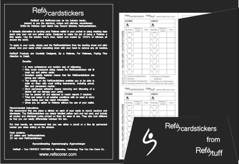 [code_snippet id=13 format] RefScardstickers (Pack of 40 Stickers) RefStuff and RefScorer.com as the industry leader, present to you the standout, unique and ultimate, revolutionary Write-On Referee Card Match Day Record Stickers; RefScardstickers. A fantastic alternative to carrying your Referee wallet in your pocket or using masking tape stuck onto your red and yellow cards. Designed…